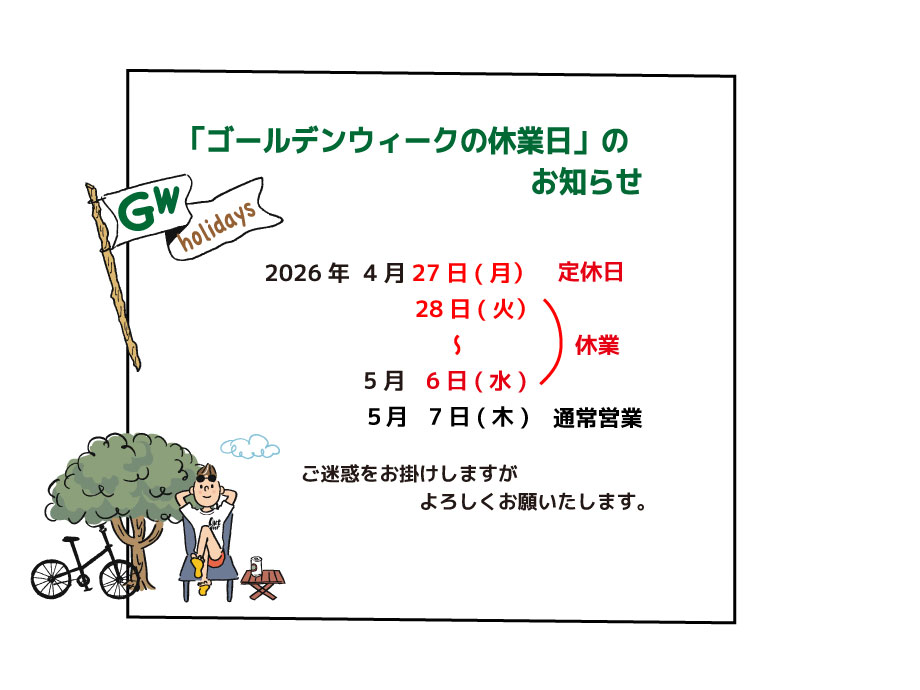 ゴールデンウィーク期間中のお休みは、4月27日(月)〜5月6日(水)まで5月7日(木)から平常営業となります。ご迷惑をおかけしますがよろしくお願いいたします。