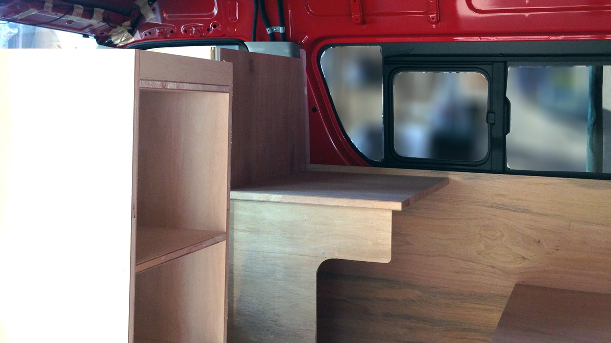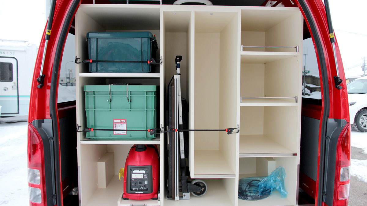 ・スチール製書棚 ・後部出入り口用階段 ・カウンターテーブル、椅子 ・車内音響、空調機器用天吊ラック