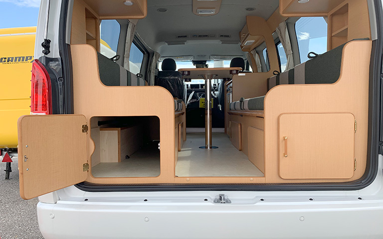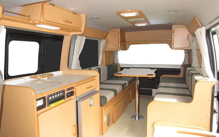 乗車定員 8名 就寝定員 大人 3名 外寸(長×幅×高) 4,840×1,880×2,105 (mm) 内寸(長×幅×高) 2,800×1,700×1,375 (mm) ナンバー 8 ベース車両 <TOYOTA HIACE ロングワイド> ロングミドルルーフ ミッション 6速AT (6 Super ETC) 使用燃料 ガソリン 総排気量 2.700cc 駆動方式 4WD 型番 3Bf-TRH219W-JDTNK