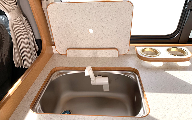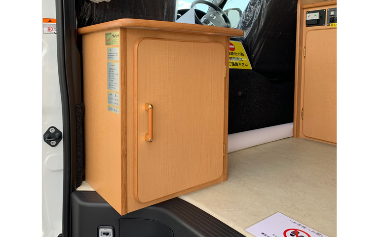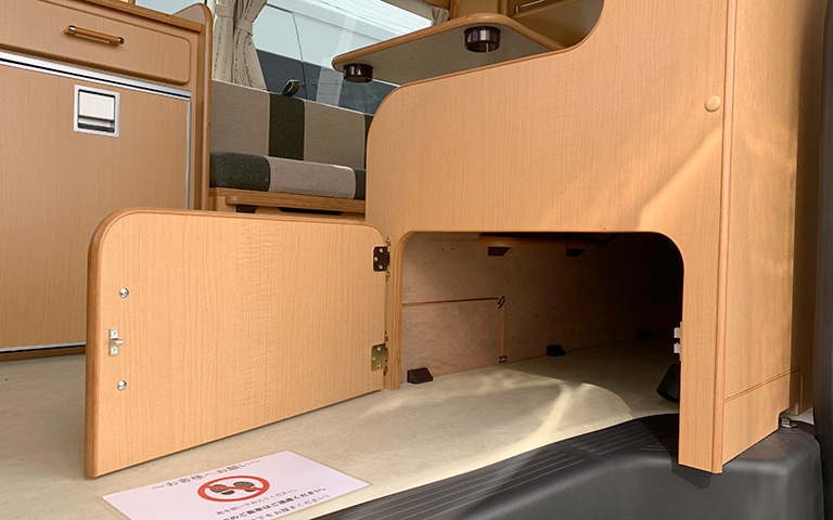 上部に扉付き収納棚、手元を照らすLEDライト。蛇口付きシンク。下部は、冷蔵庫や排水・給水タンクを収納しています。