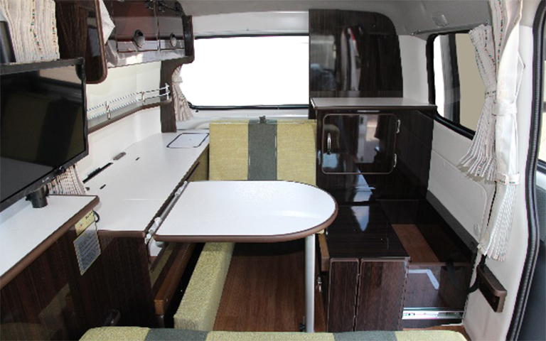 • モルトの内装は、コンパクトなのに盛り沢山。ドアを開けるとキャンピングカーには欠かせない向かい合って会話ができるダイネット。テーブルは、片足の折りたたみ式なので使わない時は側面にピタッと収納。