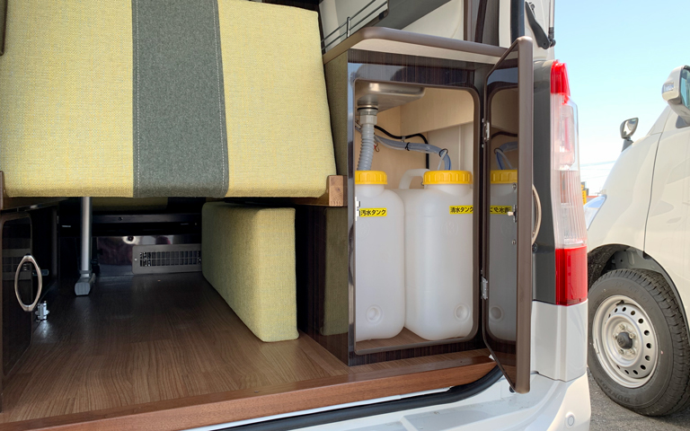 冷凍・冷蔵庫の右側には、蓋付きシンクを用意しました。シンクの下には、給排水用のスペースを確保して10ℓのタンクを二つ用意しました。また、給排水タンクの出し入れがしやすいようにバックドア側に扉を取り付けてあります。