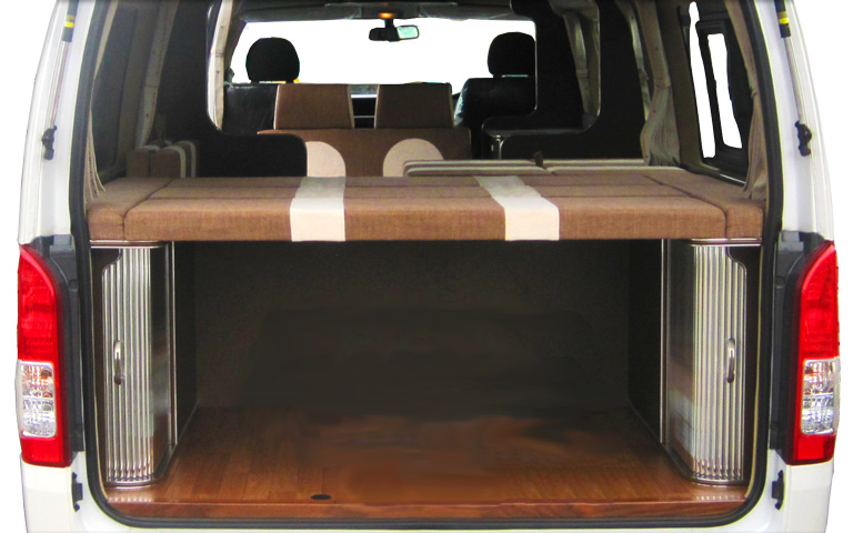 曲線のデザインルーフ収納棚、コの字型大型ルーフ収納棚などルーフを上手に使った収納棚。最後部には幅1.200mm×1.000mm×500mmの大容量のカーゴスペースを確保。ベッド天板を外すと高さを1.200mmまで確保できます。