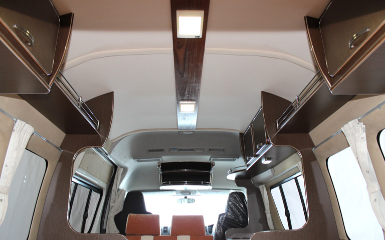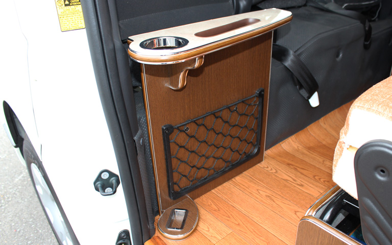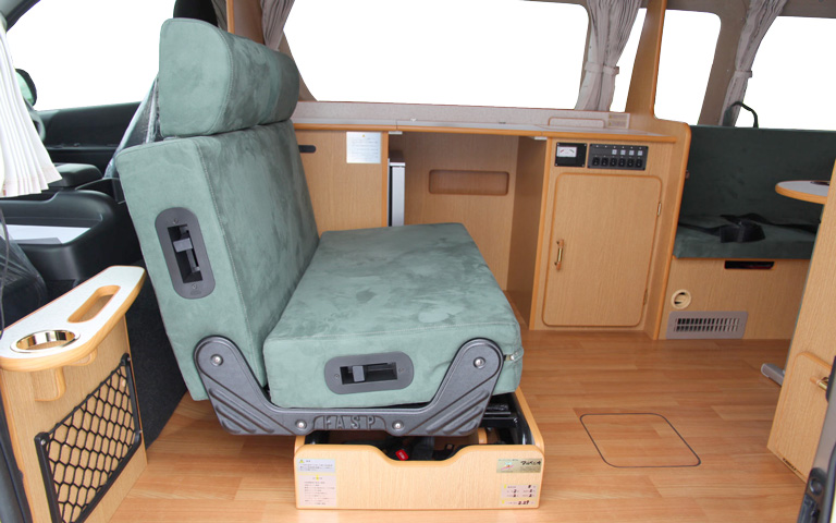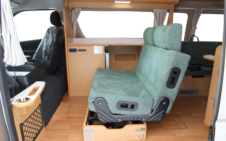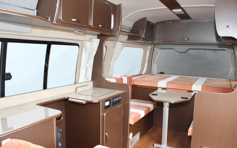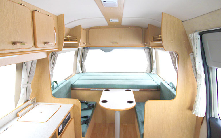 中央のダイネットには、向かい合わせで横乗り二人掛けのサードシートを配置。中央のテーブルには4つのカップフォルダーが付いたテーブルを用意しました。