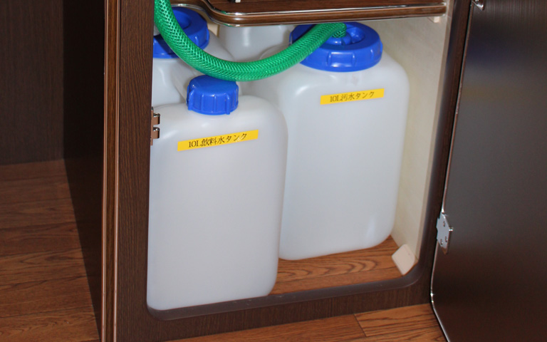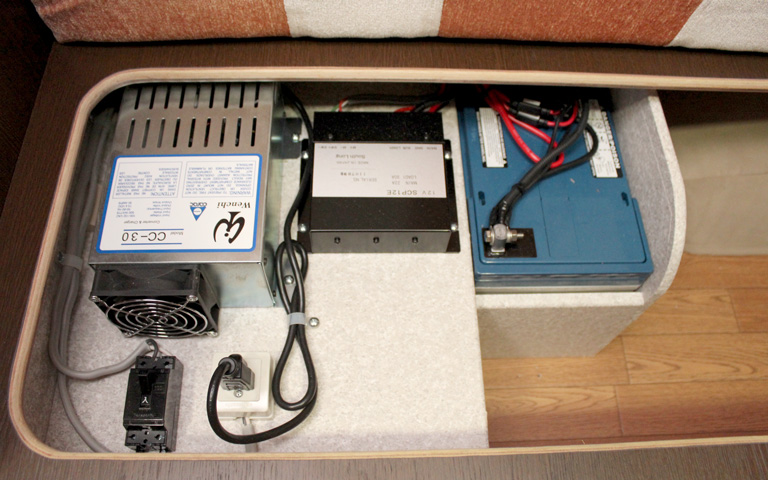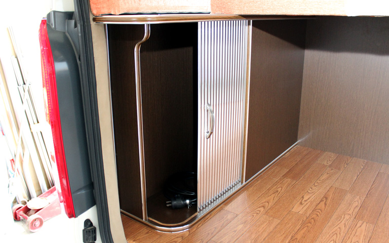 キャンピングカーに必要な電装品としてサブバッテリー(100A)、DC12V走行充電システム、AC100V充電システム、DV12Vソケットなど装備し、室内は全てLEDライトを採用。オプションとしてフロント収納棚(右の写真)