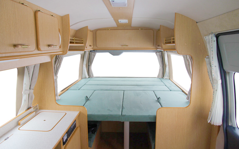 中央のダイネットには、対面式のサードシートを設置。サードシートの背もたれはワン・ツーでベッドシートに早変わり!簡単な作業で長さ1.900mm×幅1.680mmの就寝スペースを確保することができます。