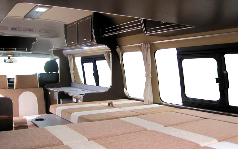 乗車定員 8名 就寝定員 大人3名 外寸(長×幅×高) 5,380×1,880×2,285 (mm) 内寸(架装部 長×幅×高) 3,400×1,720×1,610 (mm) ナンバー 8 ベース車両 <TOYOTA HIACE スーパーロング> ハイルーフ キャンパー専用車 ミッション 6速AT (6 Super ETC) 使用燃料 ガソリン ディーゼル 総排気量 2.700cc 2.800cc 駆動方式 4WD 型番 3BF-TRH226K-LRTDK6 3DF-GDH226K-LRTDY6