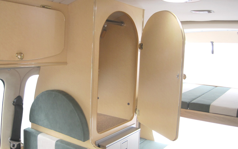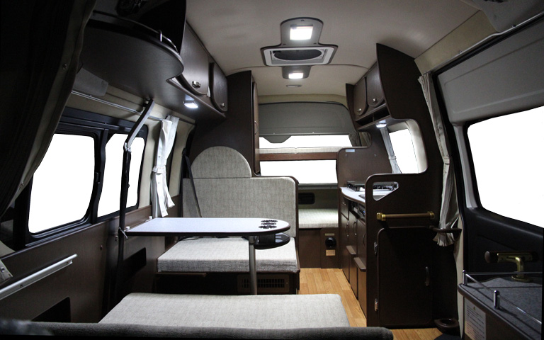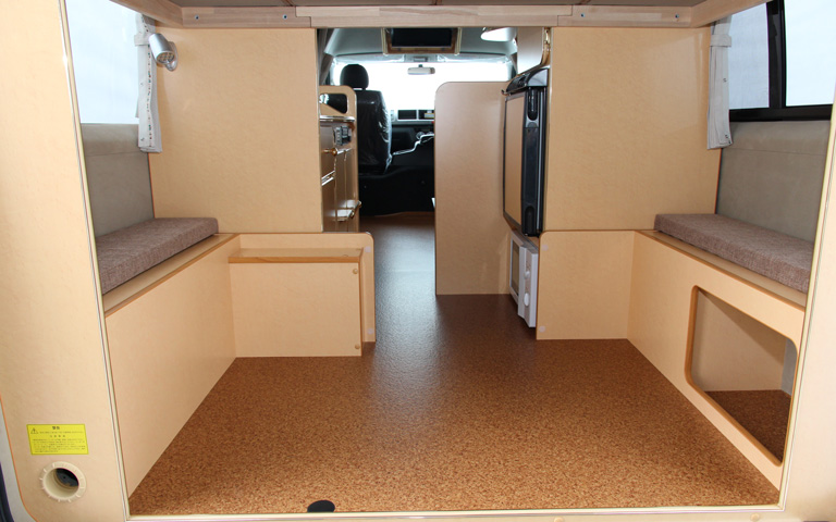 ベッドスペースは、車内中央と後部の2箇所に配置。中央部のダイネットのシートを広げると長さ1.850mm、幅1.200mmのベッドスペースに、大人二人が十二分に就寝できる広さになります。