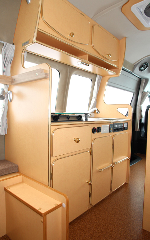 バンコンとは思えない大型キッチン。シャワーヘット付蛇口、耐熱ガラス付ツインコンロも標準で備えています。