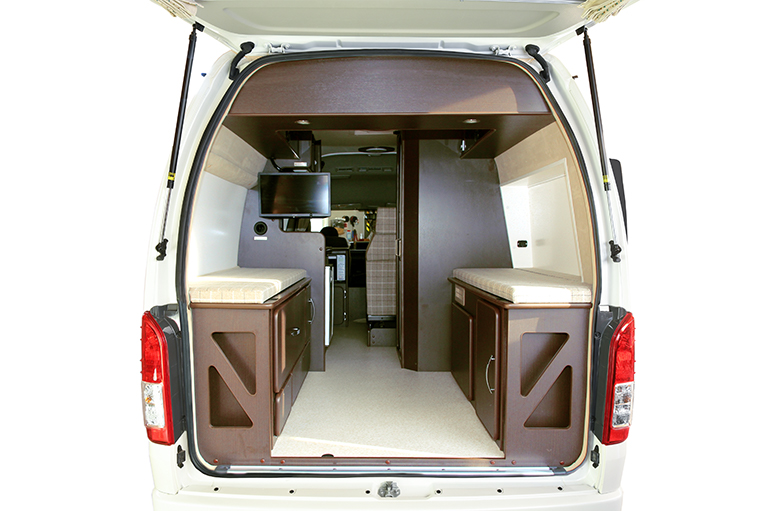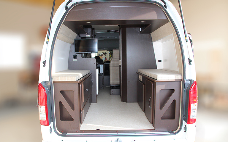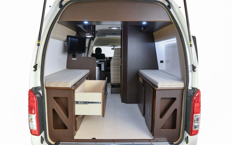 リヤ両サイドの収納キャビネットは、片方にスライドレール付きの大型収納庫をもう片方には、2段の扉付き収納キャビネットを用意しています。また、バックドアを開いた時に便利なストックボックスも忘れていません。