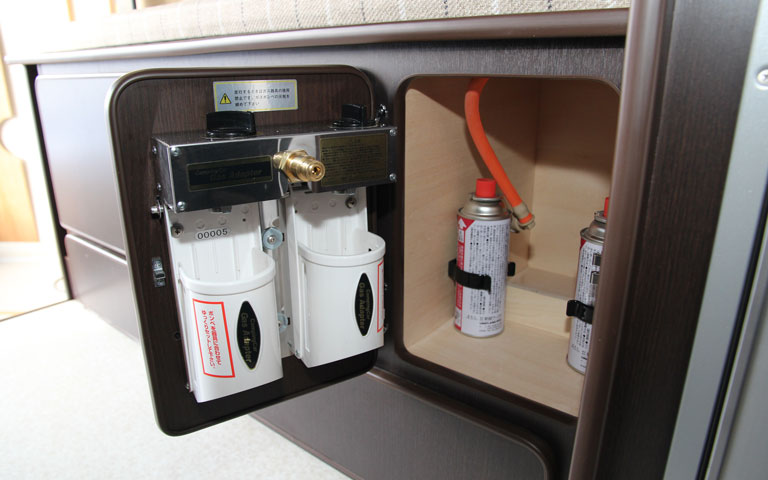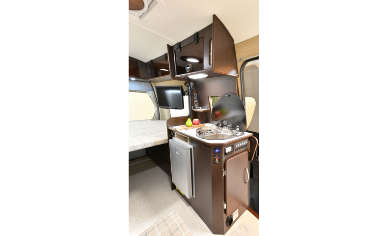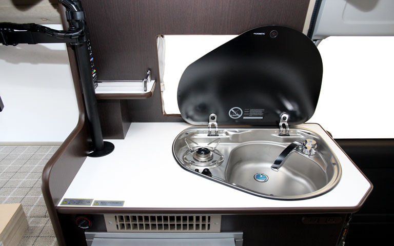 中央部にギャレーを設置。ステンレスシンクとシングルバーナーが一体化したコンパクトサイズ。ギャレーの上段には便利な収納棚とテッシュボックス。下部には、49ℓのべパスト社製冷蔵庫、16ℓ給排水タンクを2つ収納。コンパクトながらも使い勝手のいいギャレーを用意しました。