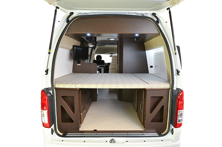 乗車定員 4名 就寝定員 大人2名 外寸(長×幅×高) 5,380×1,910×2,400 (mm) 内寸(架装部 長×幅×高) 3,400×1,720×1,610 (mm) ナンバー 8 ベース車両 <TOYOTA HIACE スーパーロング> ハイルーフ キャンパー専用車 ミッション 6速AT (6 Super ETC) 使用燃料 ガソリン ディーゼル 総排気量 2.700cc 2.800cc 駆動方式 4WD 型番 3BF-TRH226K-LRTDK6 3DF-GDH226K-LRTDY6