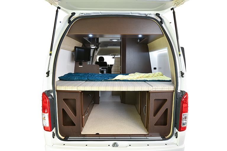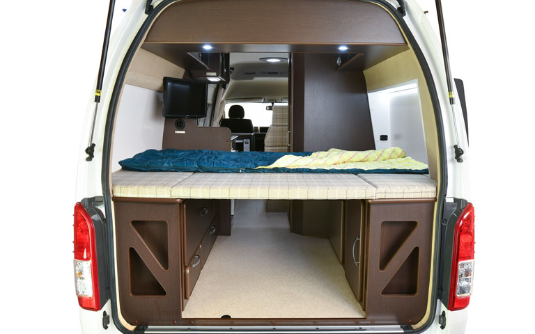 Repeatのベッドスペースは、ハイエースをベースにしたキャンピングカーにはめずらしい〈横向き就寝〉を採用。アウトパネルを取り付けることで全長1,850mm×幅1,360mmの「大人が2人、横向きに寝れる」を実現。大人用シェルフを横向きに広げても大丈夫。横向きに就寝できるだけで車内の使い方がグーンと広がります。また、取り付けたアウトパネルの上部にスポットライトを取り付けたことで明るさも確保しています。
