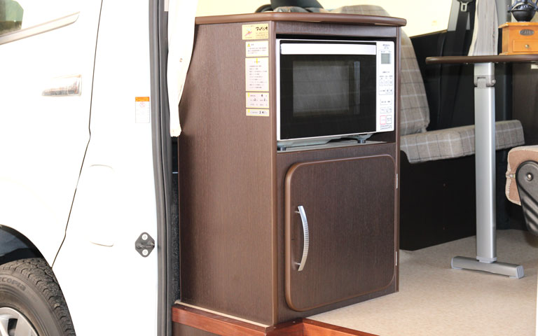 ゆったり旅をするには荷物の収納スペースも肝心。後方部上部にコの字型にアクリル板扉付き収納棚を設置。昇降口の左に電子レンジキャビネットを取り付けています。上段は電子レンジ用スペース、下段は扉付きの収納棚になっています。