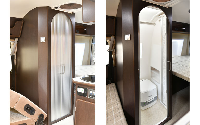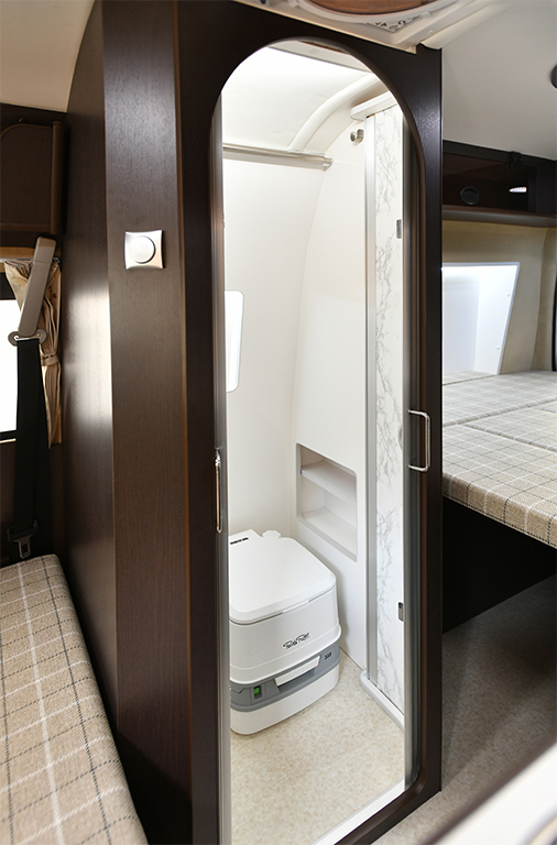 《Repeat》の魅力は、ポータブルトイレが置ける多目的ルーム。軽く開け閉めできる両開きのドアをつけ、中には小物をストックできる棚とスポットライトを取り付けました。ポータブルトイレを使用しない時にはハンガー用のポールがあるので衣服の収納に活用したり。もちろん普通の荷物入れにもご利用ください。