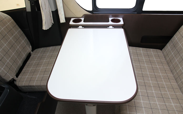 運転席後部を利用して向かい合わせに座れるダイネットは、開放感たっぷり。運転席を倒すことでフロントと両サイドのウインドウを合わせ180度の眺めを見ながら時を過ごせます。